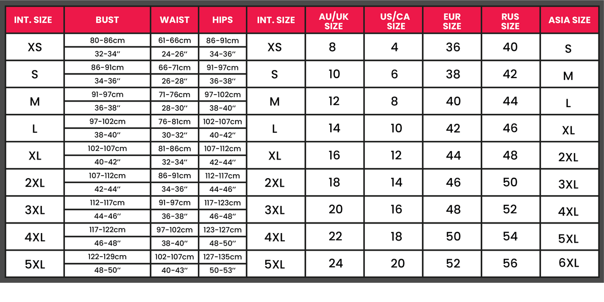 Please refer to our size chart to find your perfect fit. If unsure, we suggest you choose one size up: