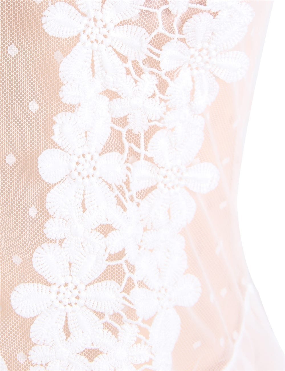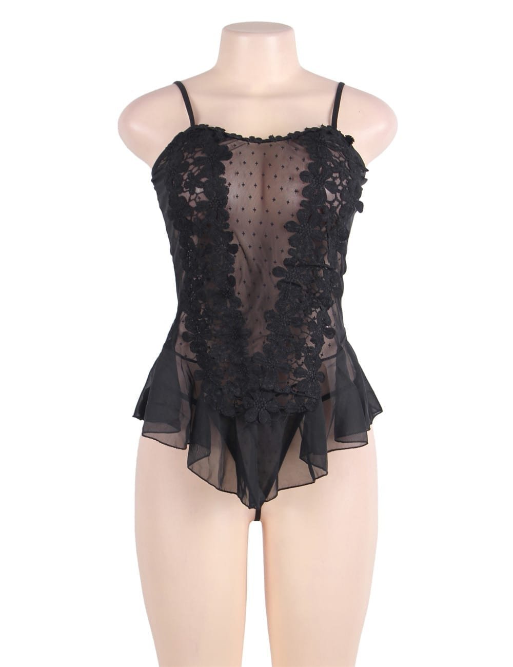 Elevate your intimate wardrobe with the Flower Lace Babydoll by My Secret Drawer®. This exquisite babydoll effortlessly blends playful charm with sensual sophistication, crafted from sheer, stretchable mesh embroidered with delicate polka dots for a captivating visual allure. The standout V-shaped floral lace detail draws the eye from bust to crotch, beautifully accentuating your natural curves while ruffles add a flirty, feminine touch.