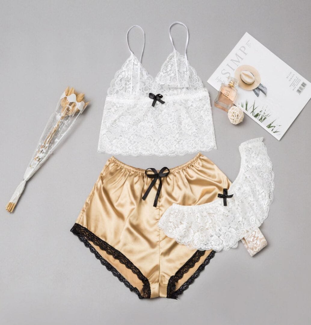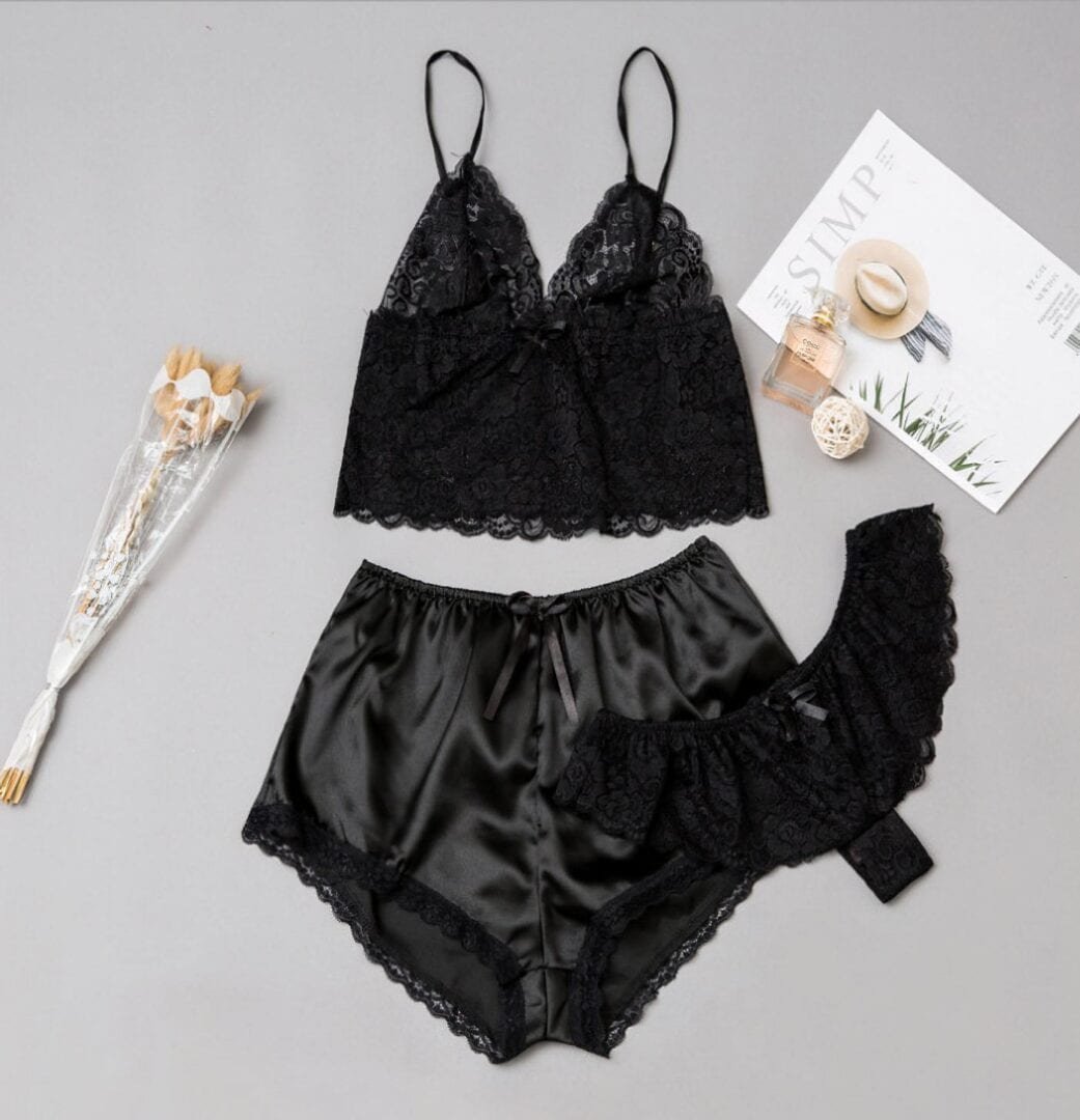 • Three-piece sleepwear set comprising lace top and panties and satin shorts