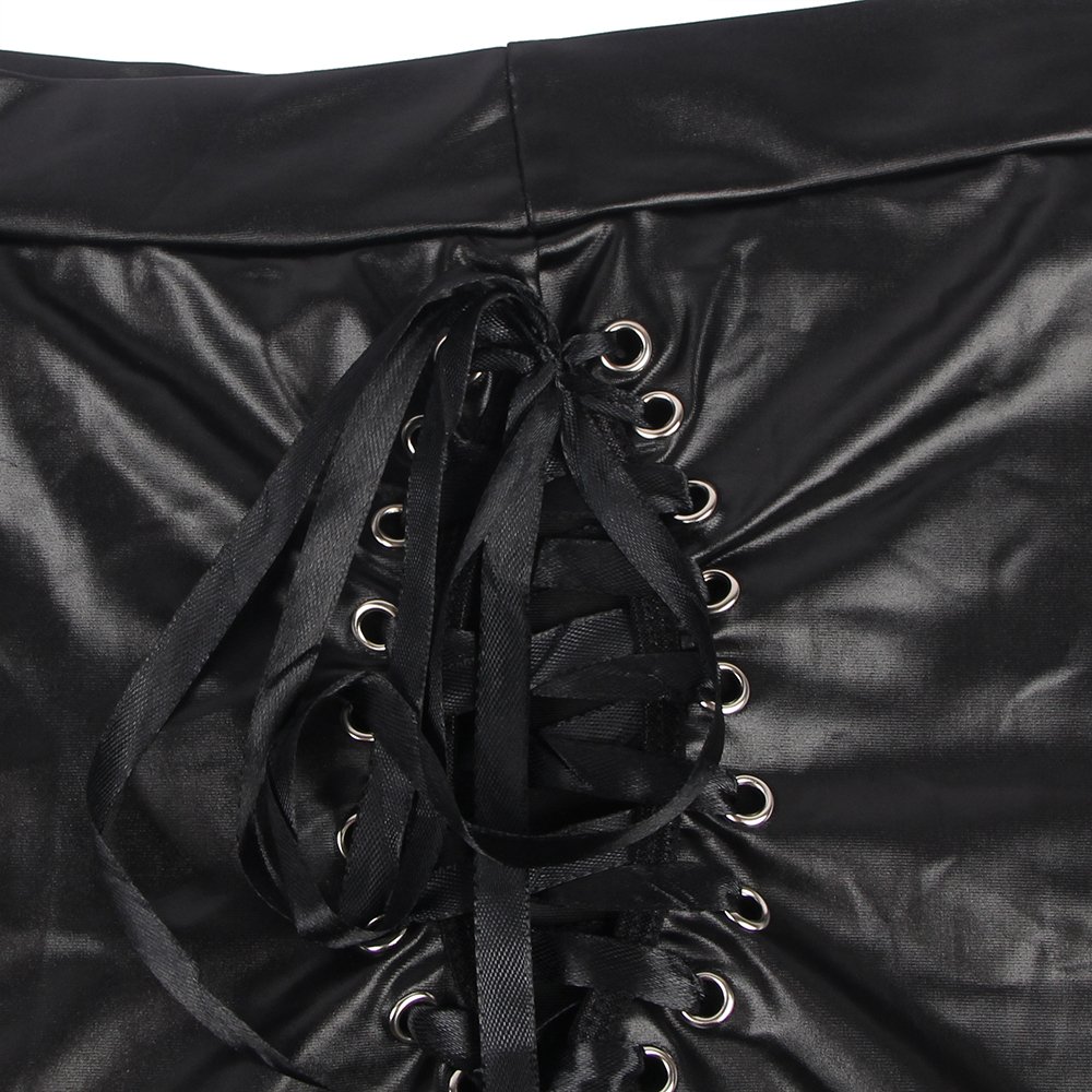 The figure-hugging faux leather skirt, detailed with lace-up accents, sculpts your silhouette to perfection, emphasizing your commanding presence. Included is a spanking paddle whip, designed to elevate your playful scenarios and ignite imagination within your private playroom.