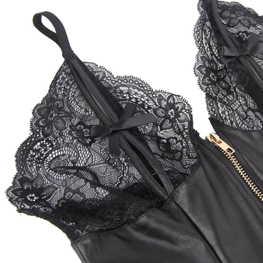 - Features tempting bows over nipples and a zip that goes way past paradise